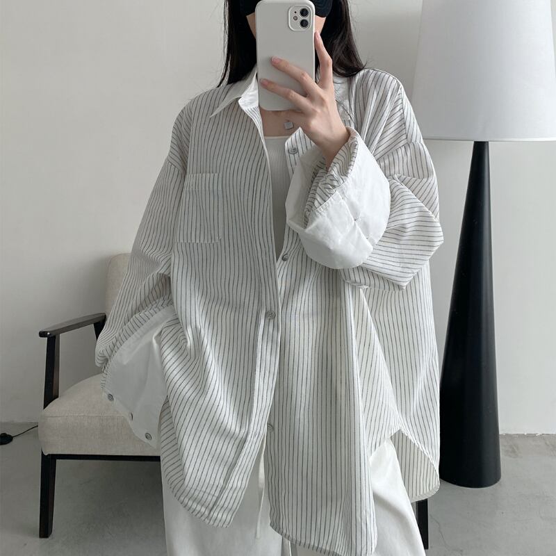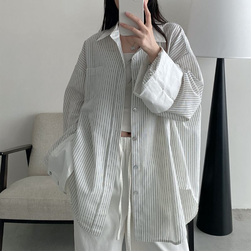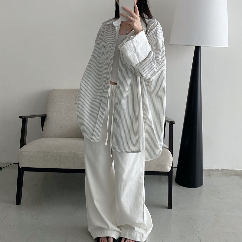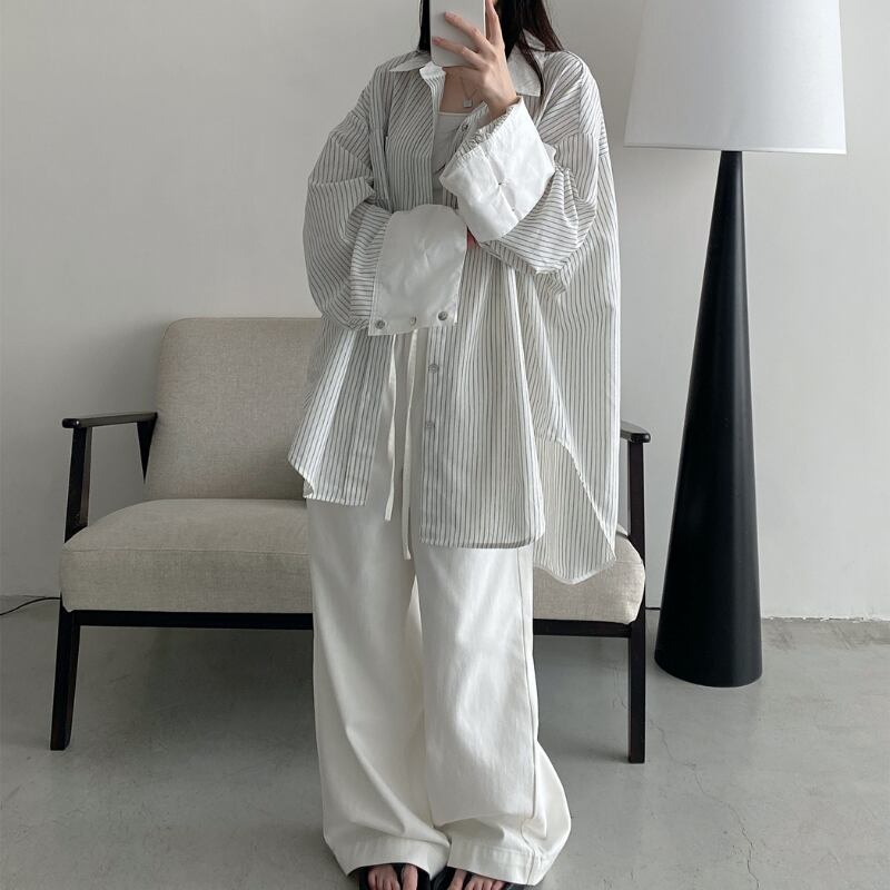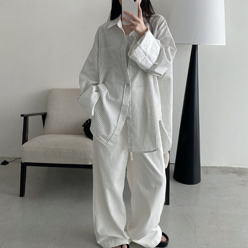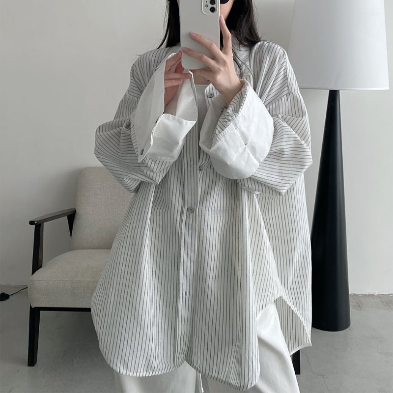 Linen cotton white vertical striped large sleeve shirt (SN304)