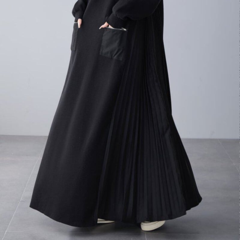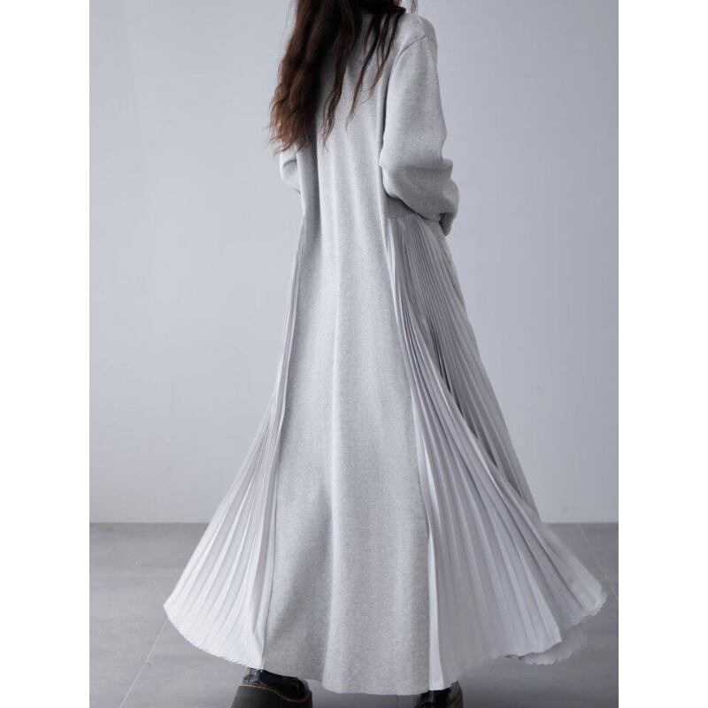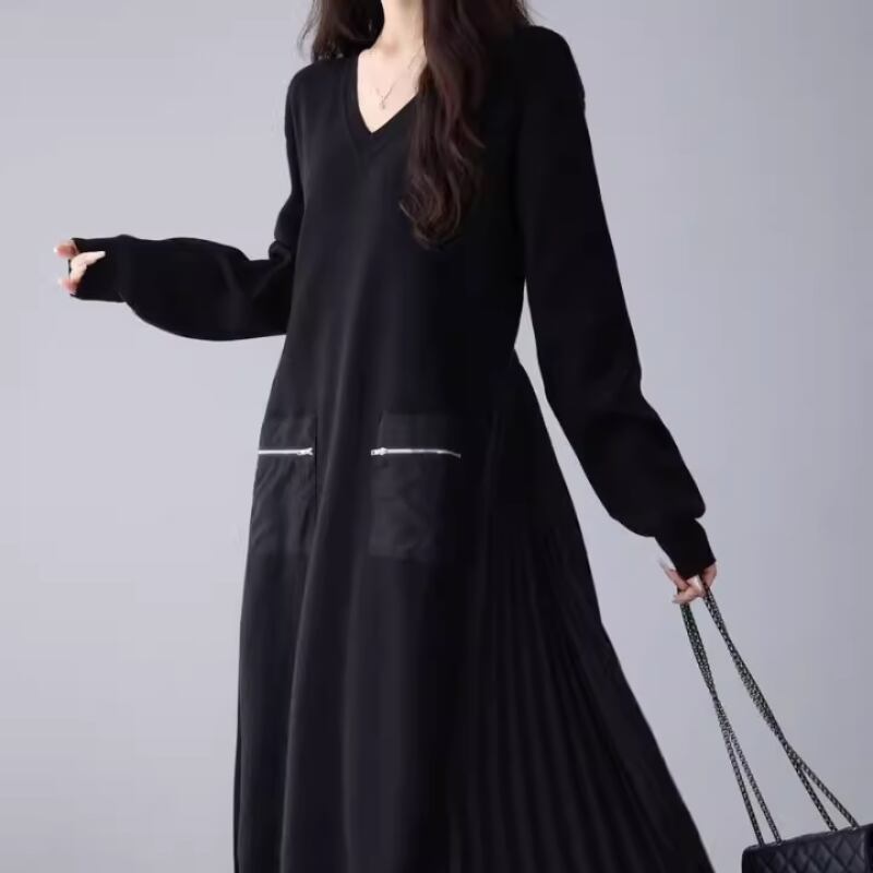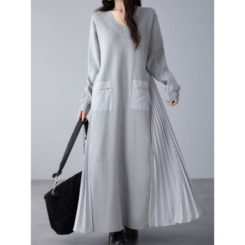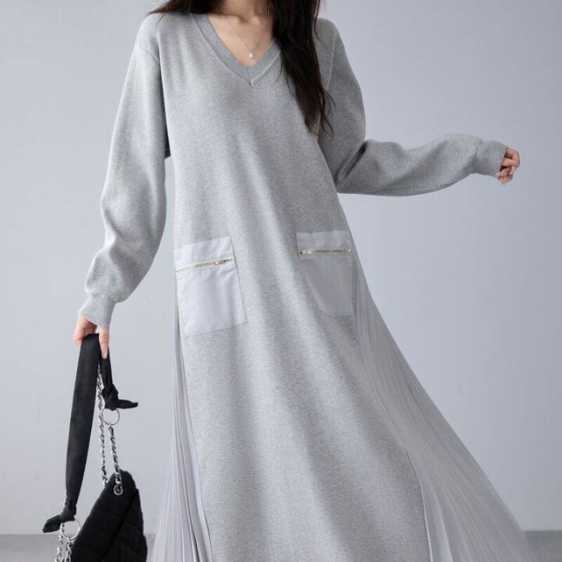 Loose V‑neck dress with side pleated panels and knit splicing (SN351)